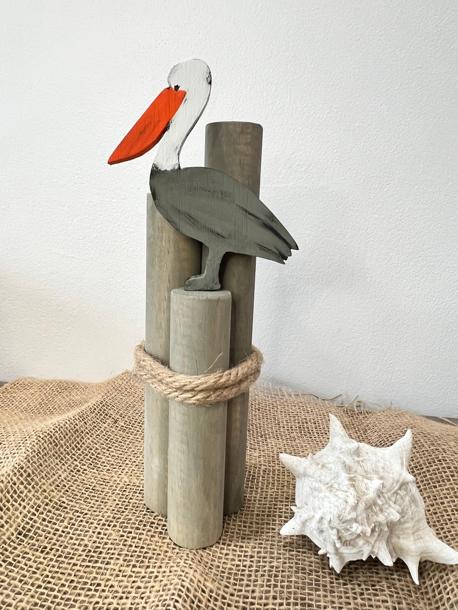 Beach Pilings with Pelican: Coastal Shelf Decor