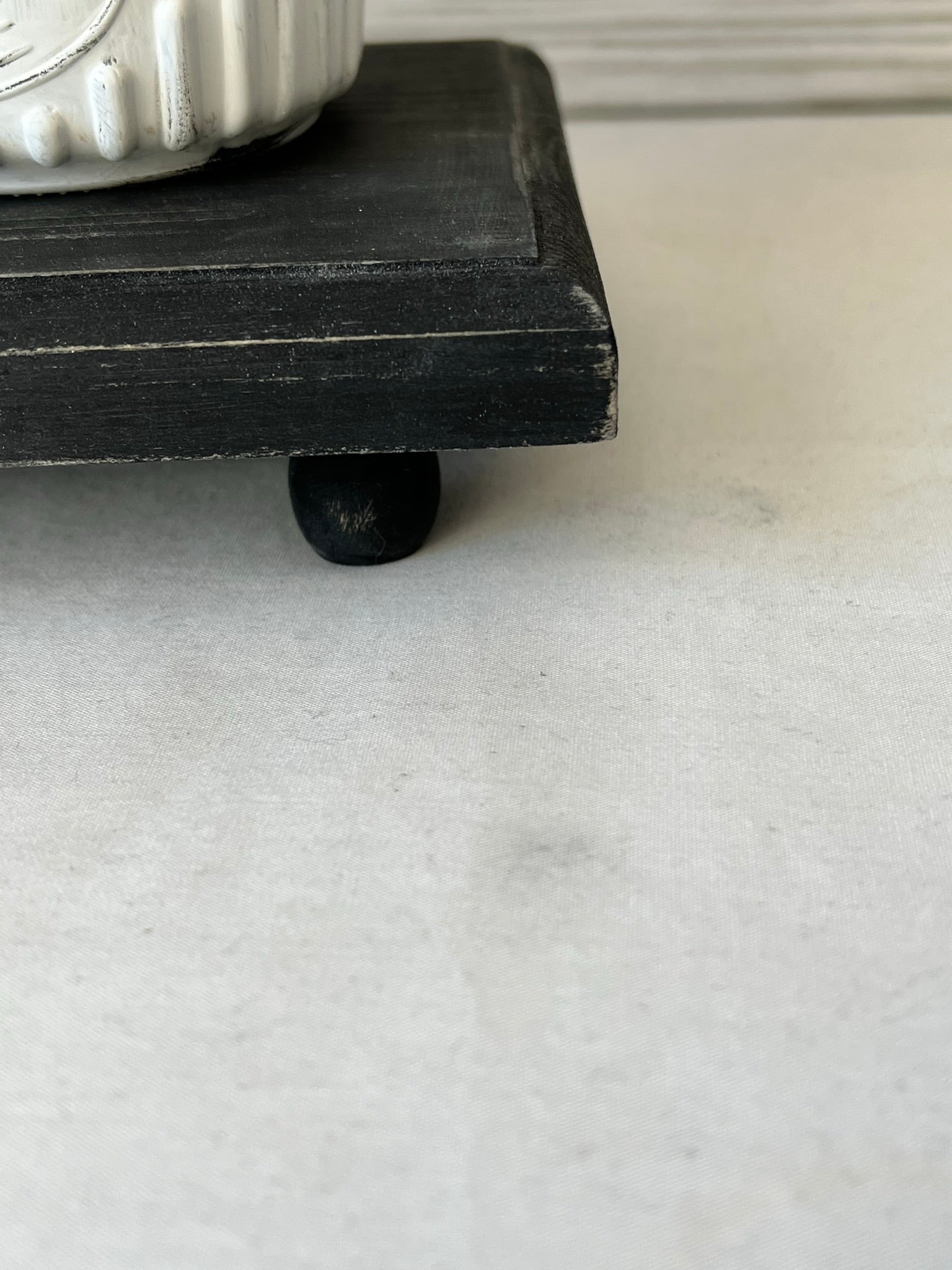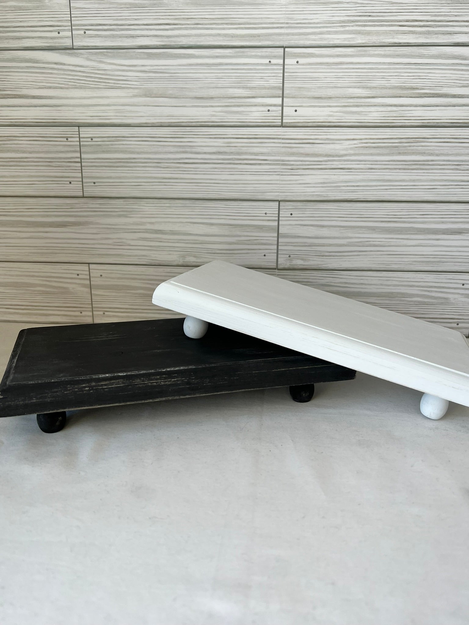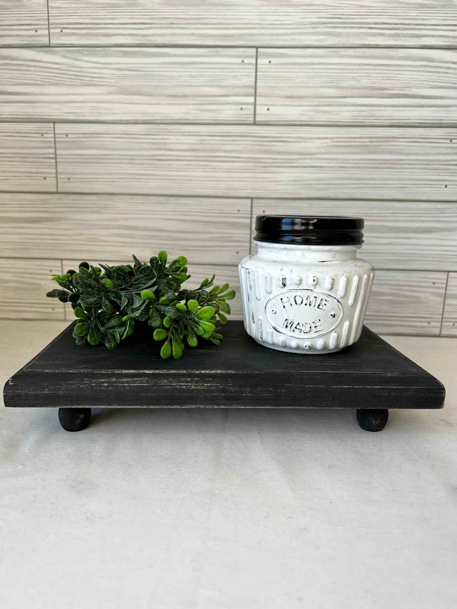This single tray counter riser is finished in Distressed Black or White for a very rustic look. Edges of tray are routed, tray sits atop 4 candle cup feet for tabletop protection. Trays have matte, rustic look to them.