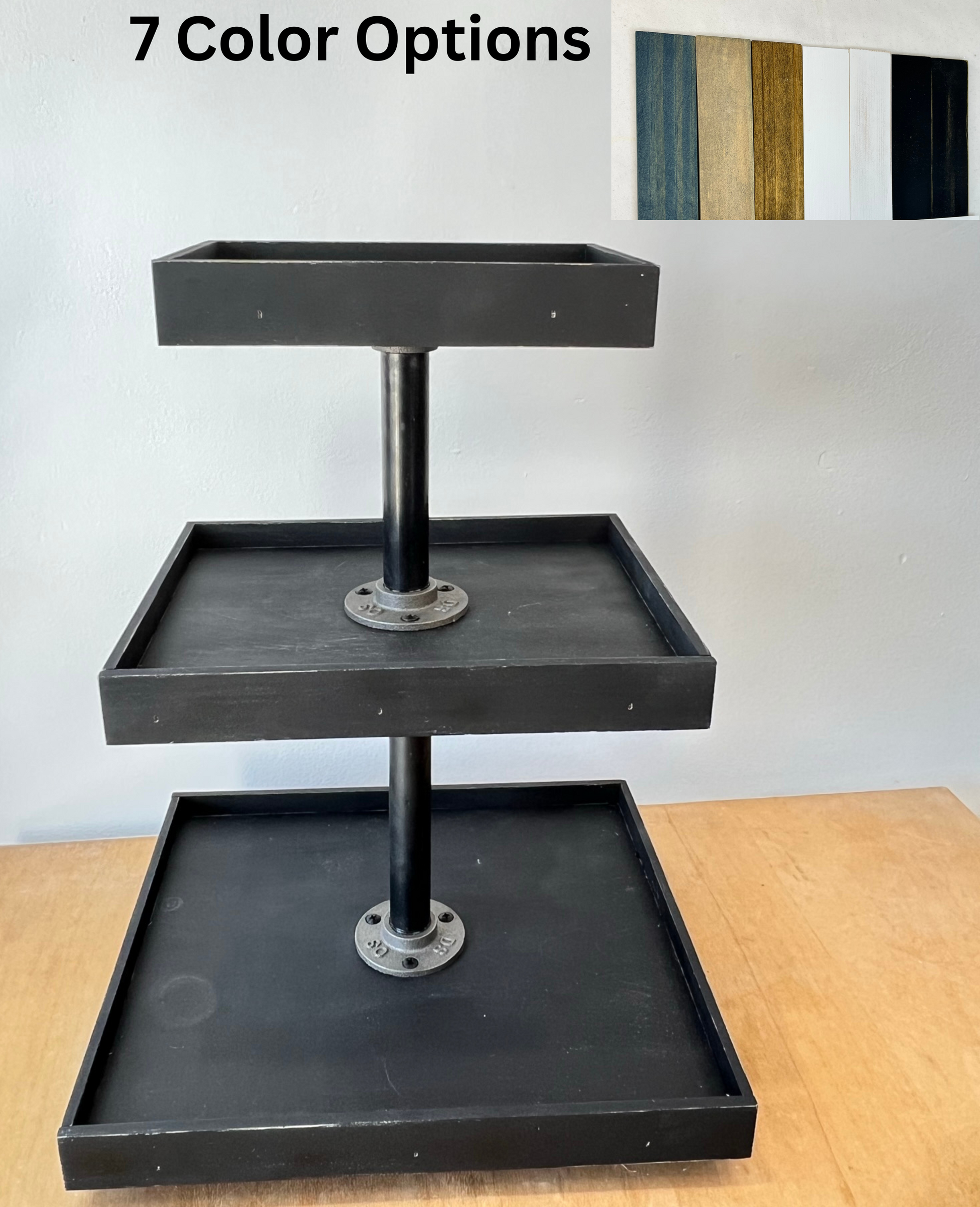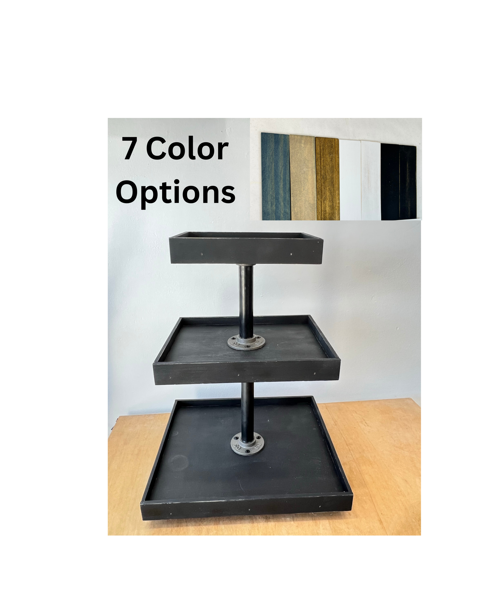 Trays made from premium wood. Imperfections in wood are preserved for a rustic look and may include imperfections. All wood is sanded and sealed. Tiers breakdown for shipping, some easy assembly required.