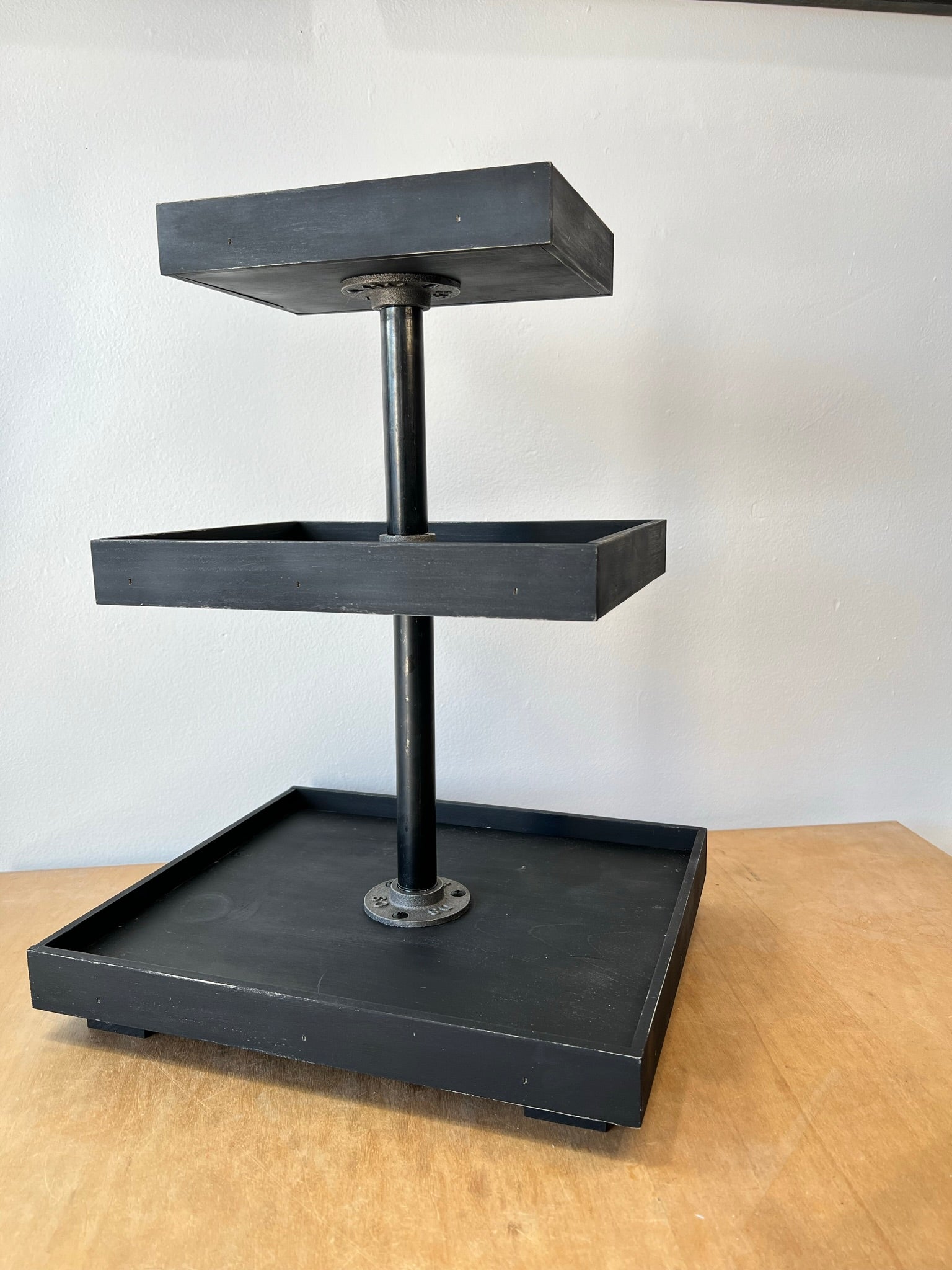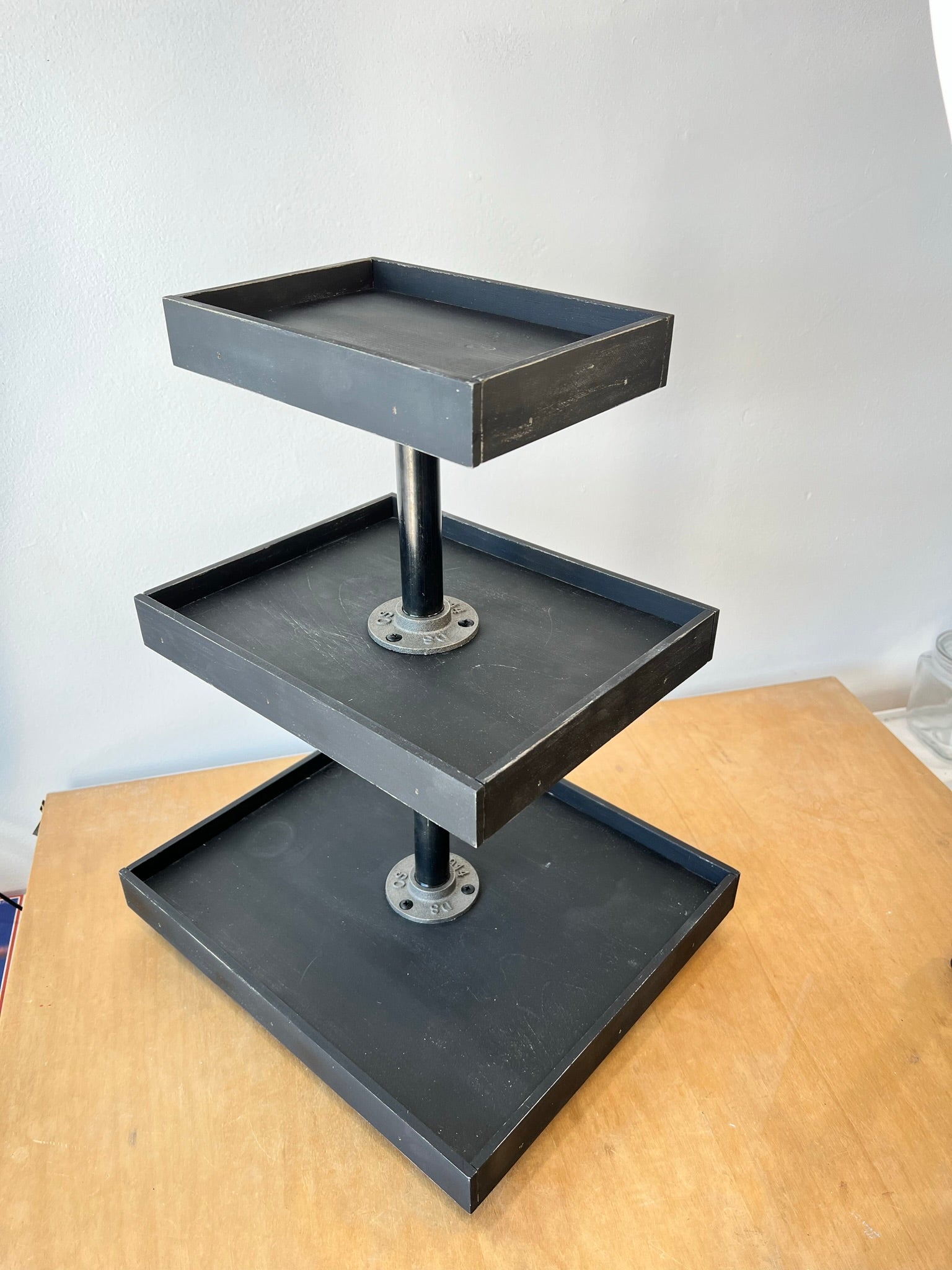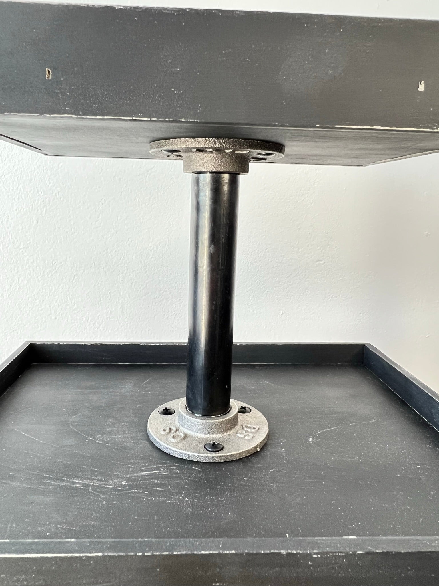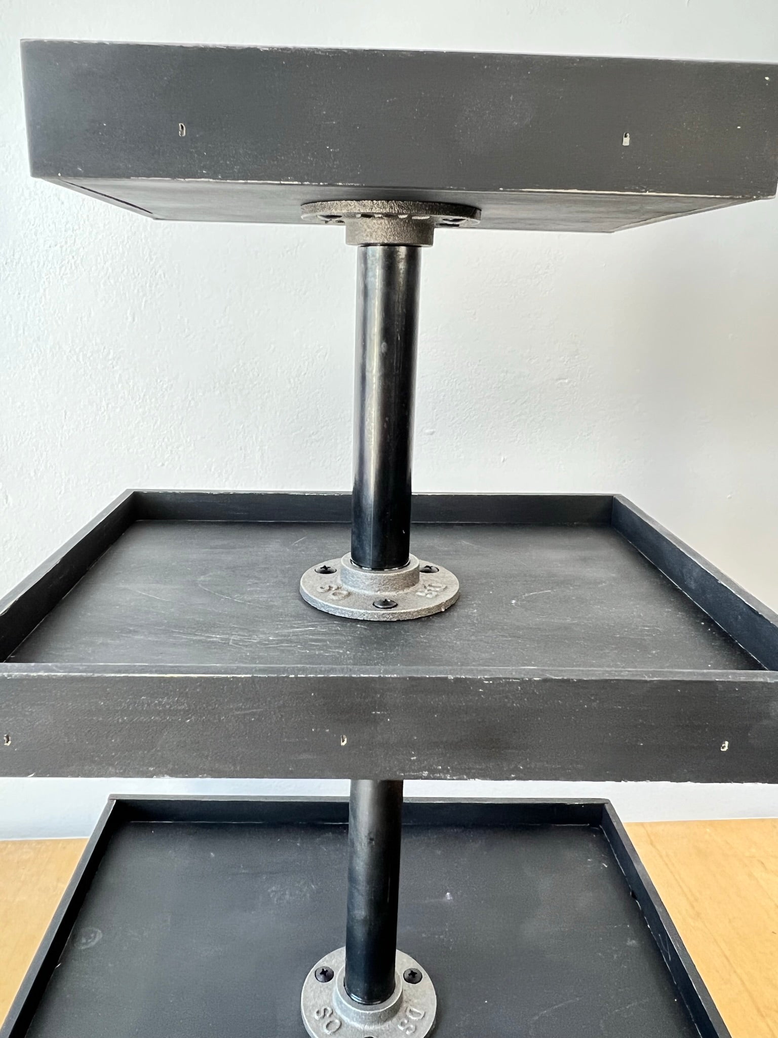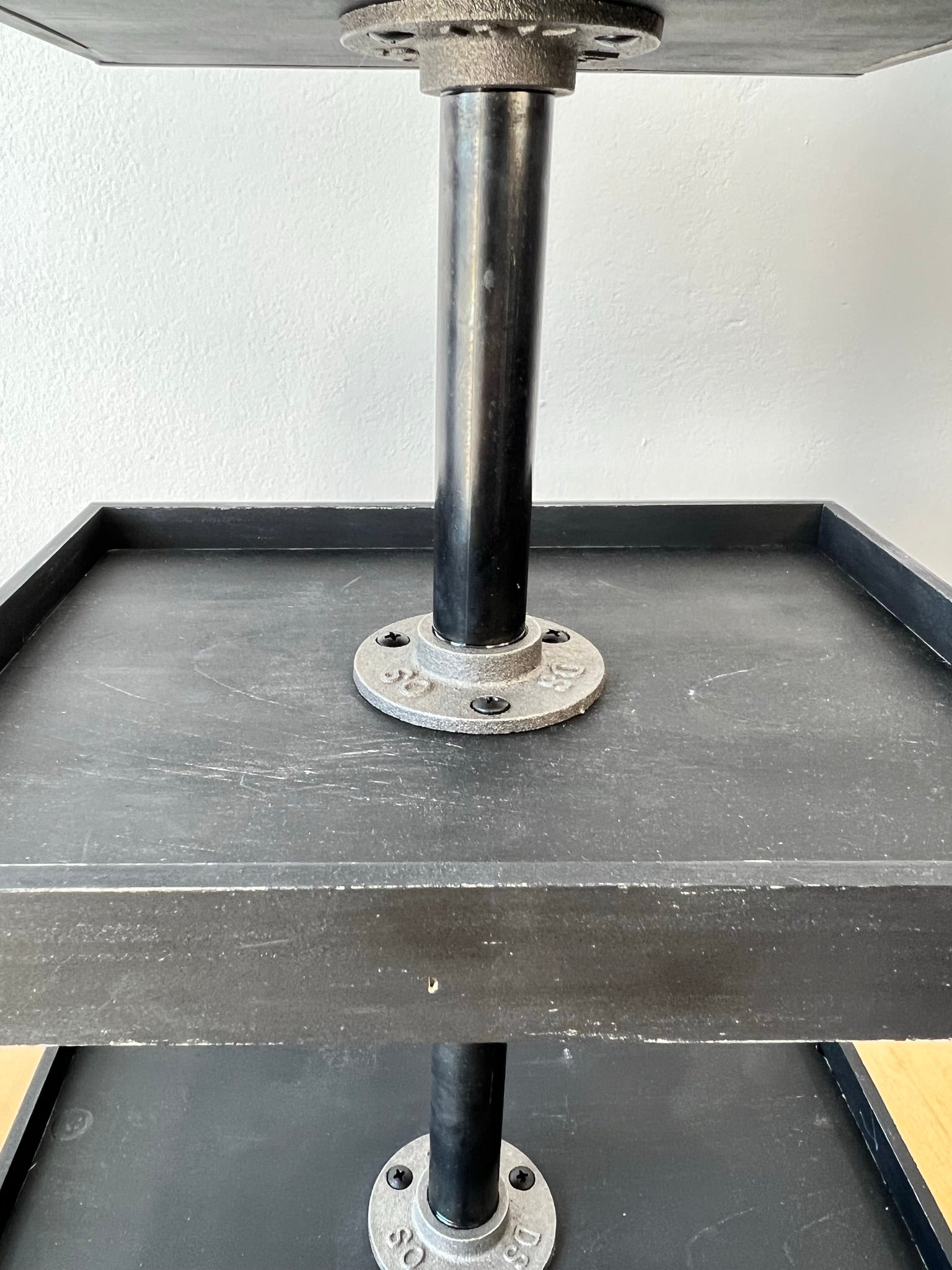 * dark gray iron flanges with black iron 8 in pipe between bottom and middle tray,
