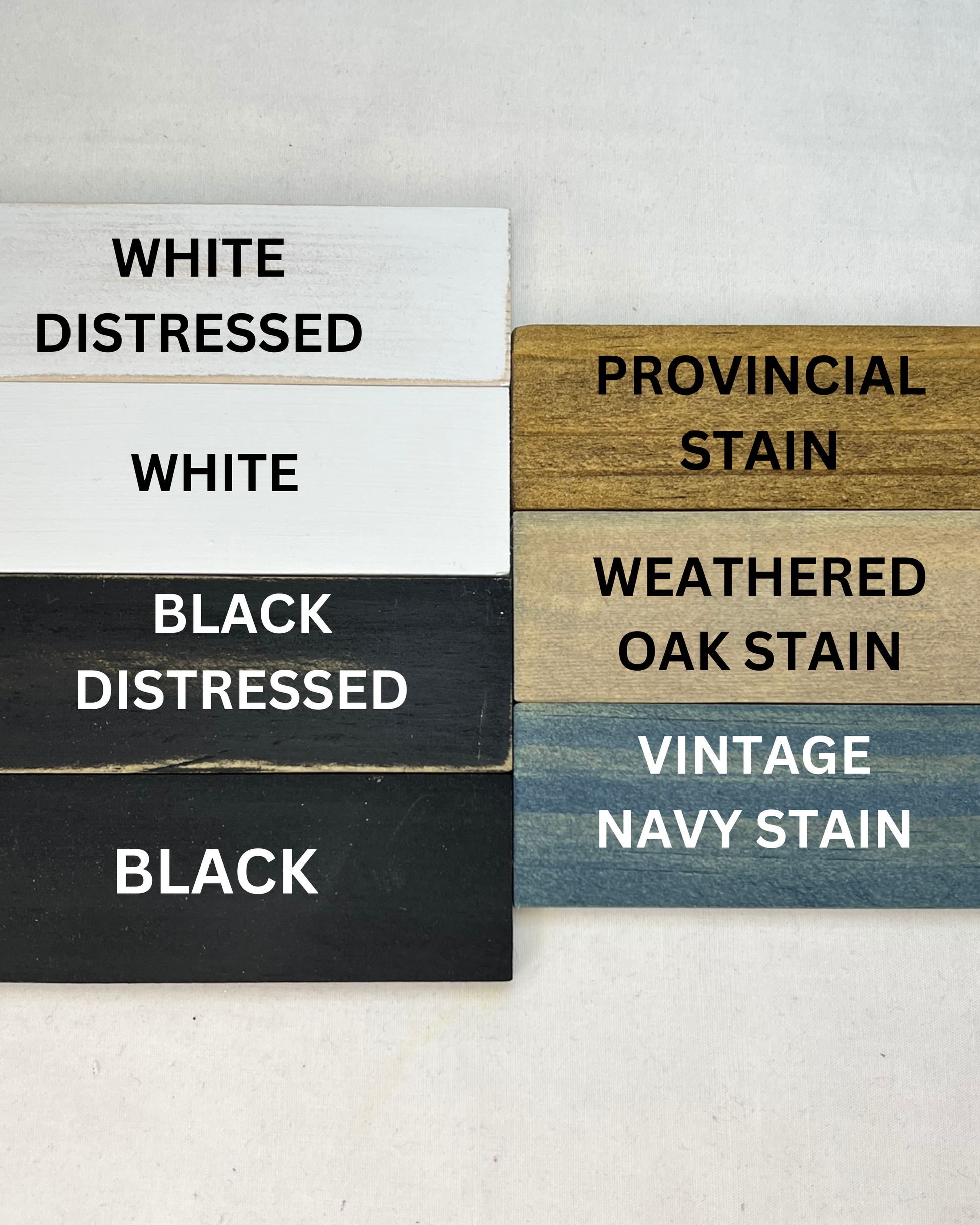 White, White Distressed, Black, Black Distressed, Provincial Stain, Weathered Oak Stain, Vintage Navy Stain