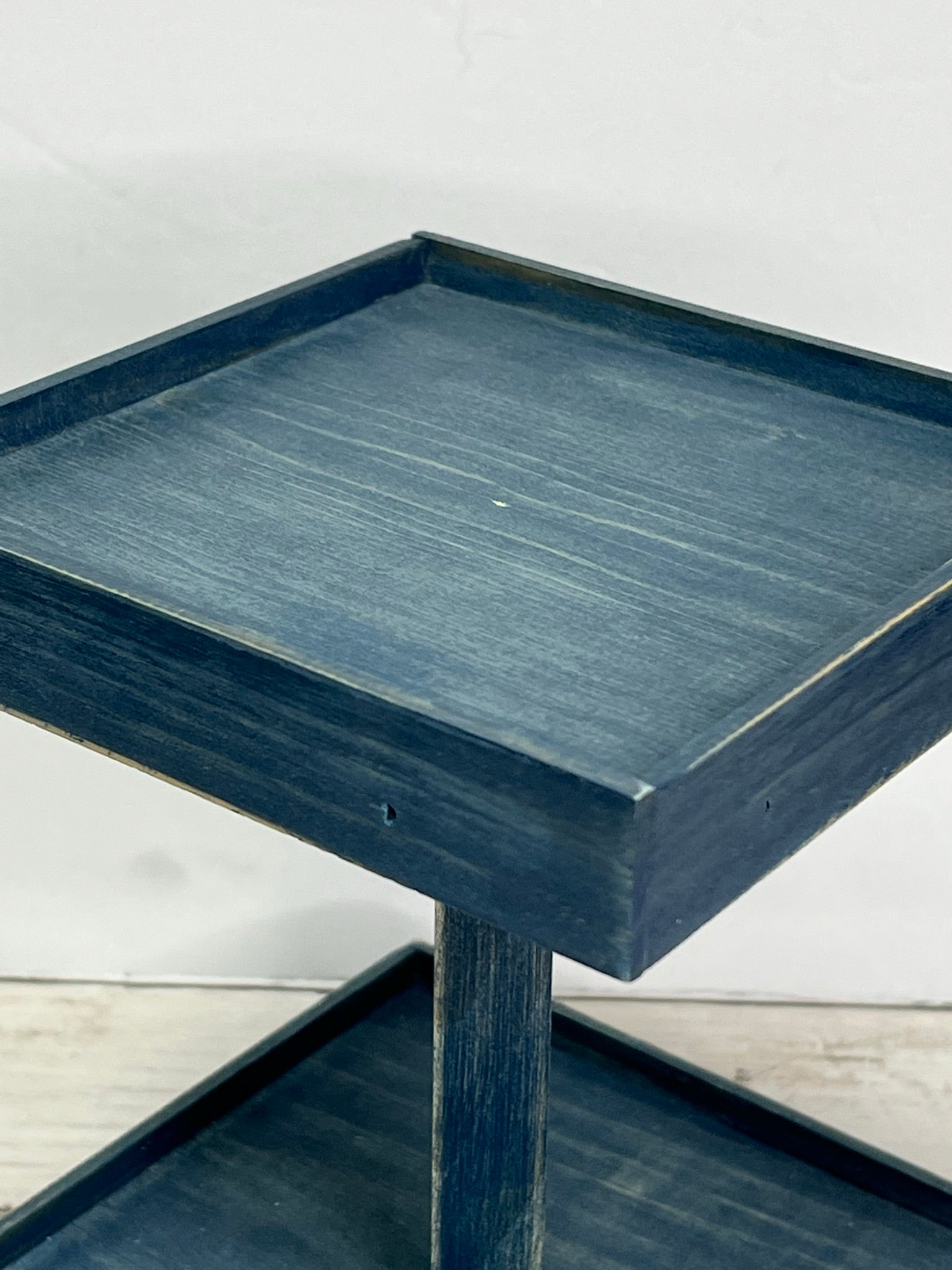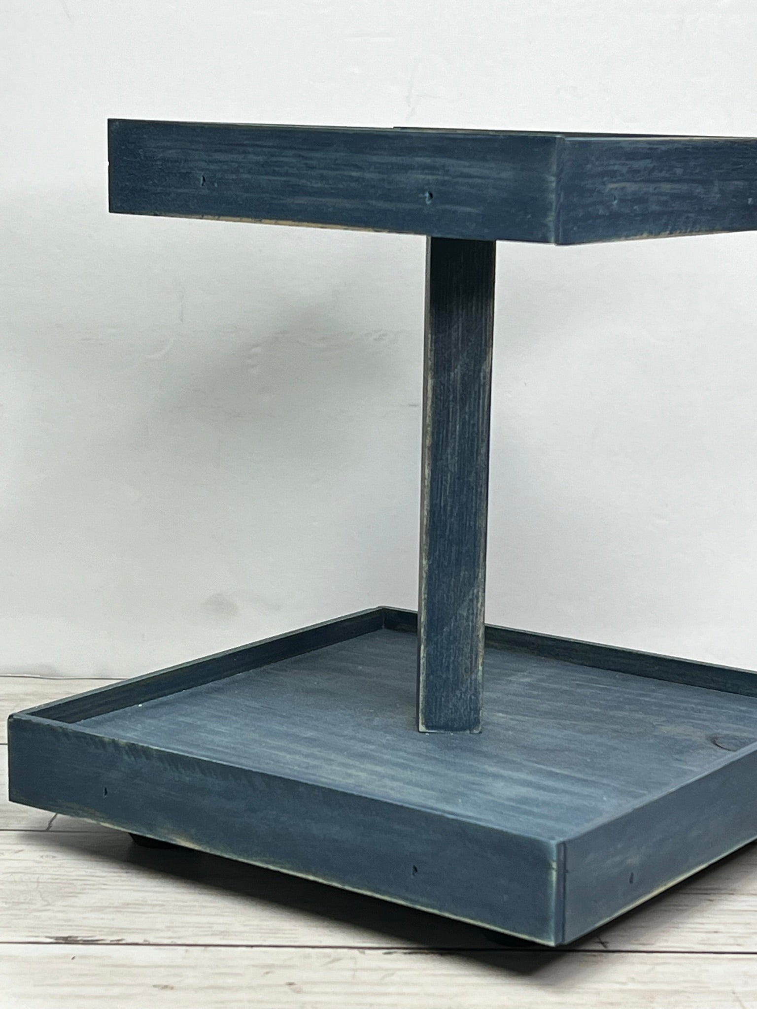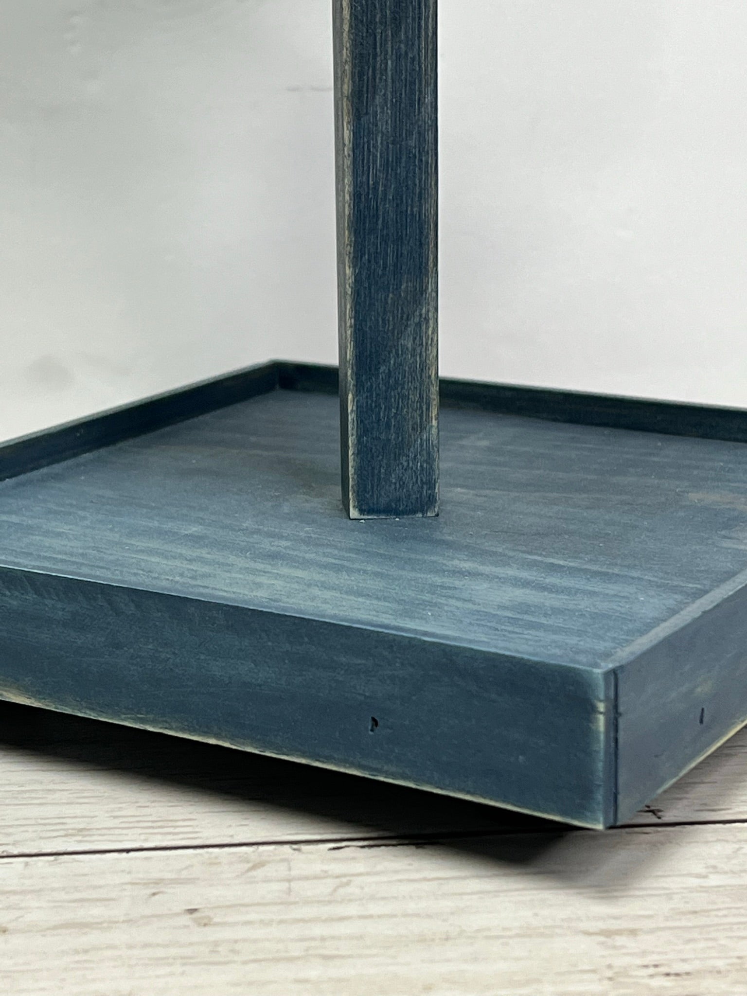 This small two tier tray is finished in a worn navy stain. This stain has a worn, rustic look that allows the wood grain to show for a perfect rustic farmhouse look.. Sits atop small candle cup feet to protect tabletops and has a 7 inch fixed square dowel in the center. Trays have small edge on them to keep things from falling off.