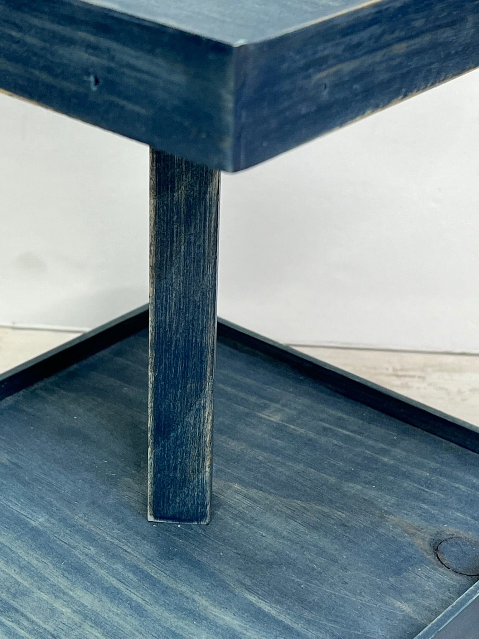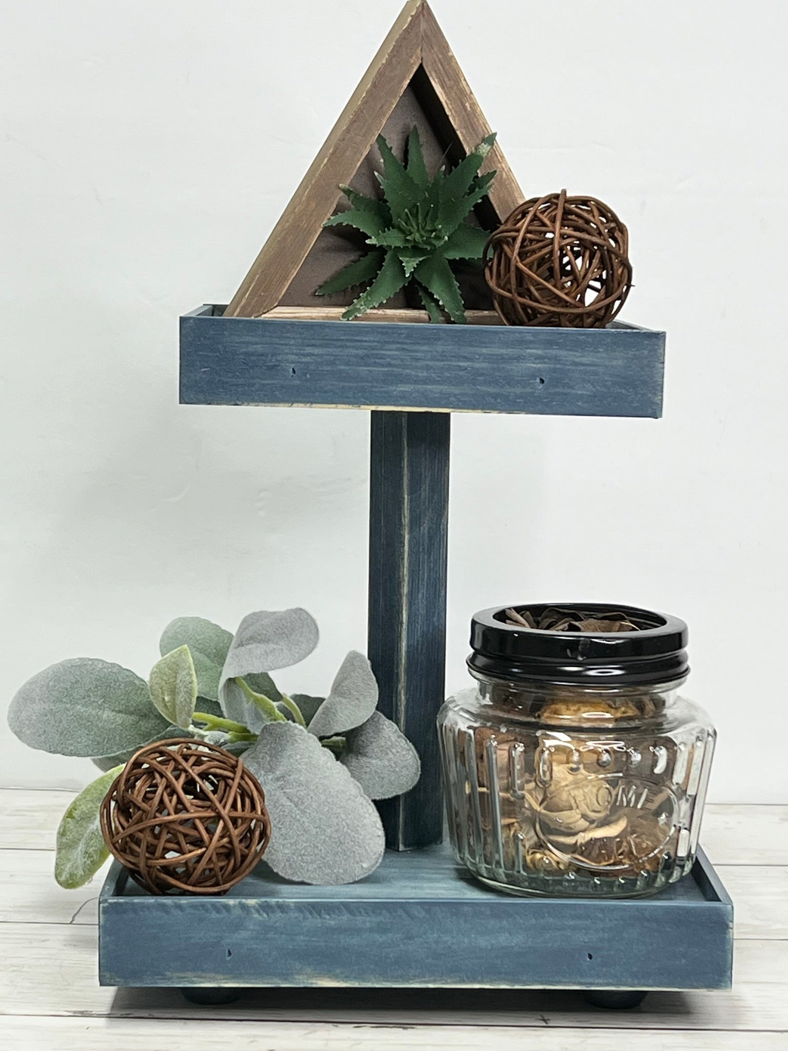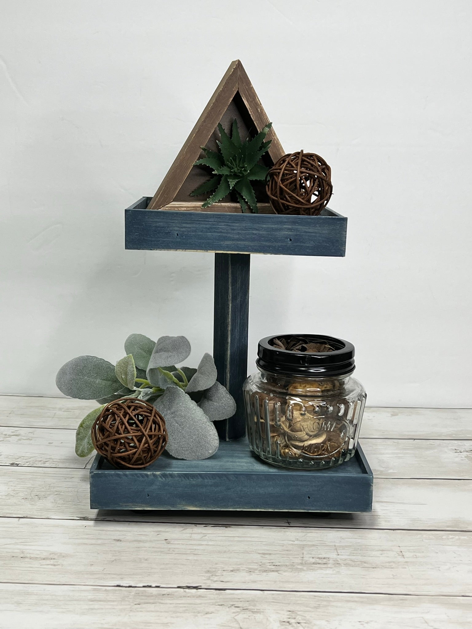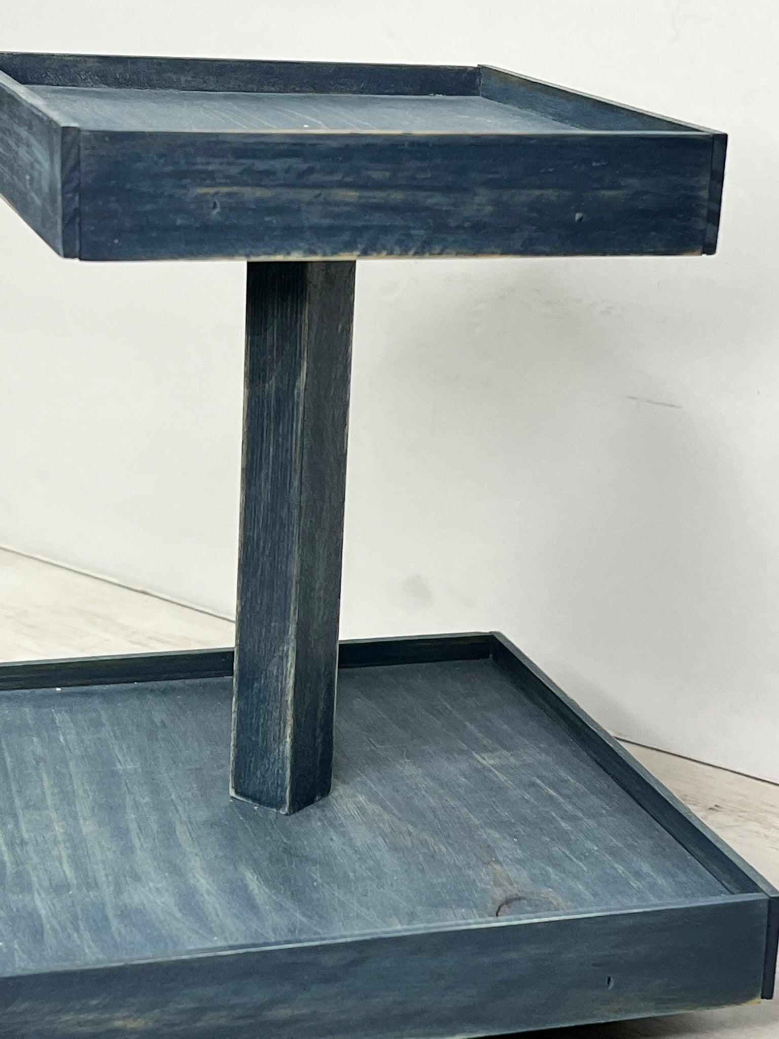 This small two tier tray is finished in a worn navy stain. This stain has a worn, rustic look that allows the wood grain to show for a perfect rustic farmhouse look.. Sits atop small candle cup feet to protect tabletops and has a 7 inch fixed square dowel in the center. Trays have small edge on them to keep things from falling off.