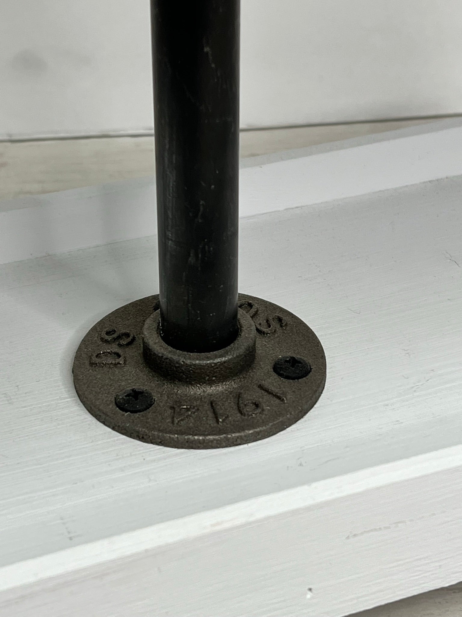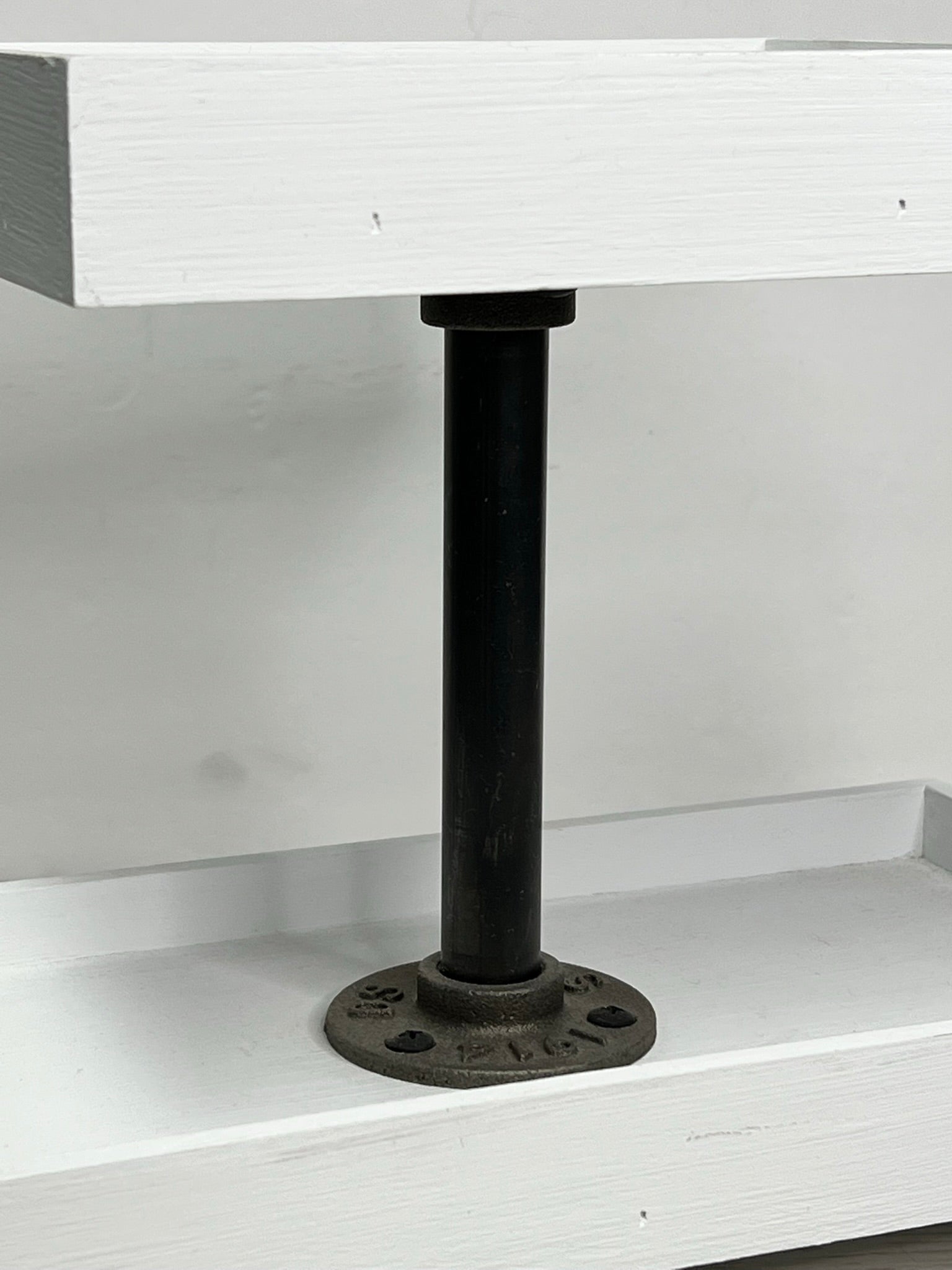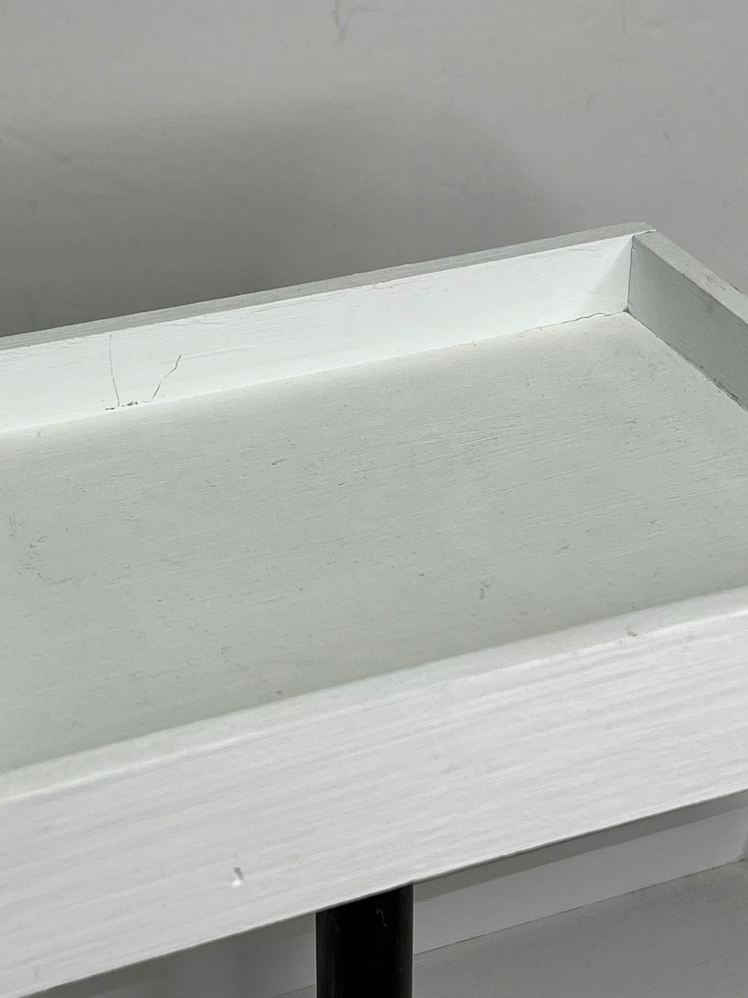Tray is rectangular in shape finished in white chalk paint with iron flanges and pipe between trays. Tray sits on 4 feet for tabletop protection.